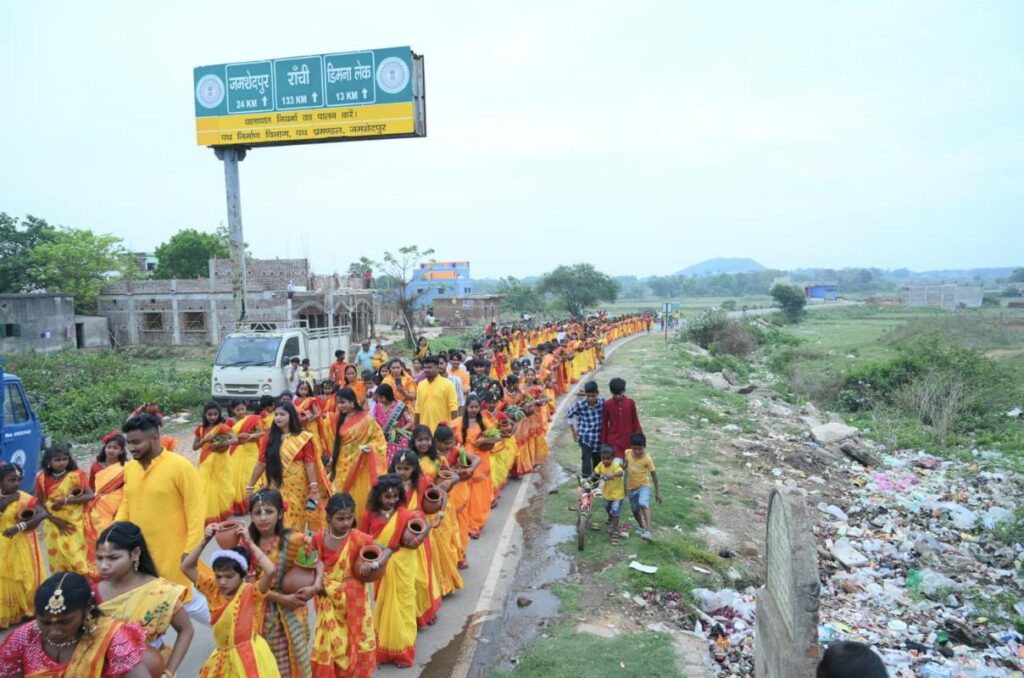 Patamda: चैत्र नवरात्र के मौके पर अन्य वर्षों की भांति इस वर्ष भी पटमदा एवं बोड़ाम प्रखंड अंतर्गत 4 जगहों पर बांसती दुर्गा पूजा का आयोजन हो रहा है। सप्तमी तिथि को श्री श्री सार्वजनिक बासंती मंदिर पूजा कमेटी बोड़ाम की ओर से भव्य कलश यात्रा निकाली गई। इसमें बोड़ाम गांव की 151 कुंवारी कन्याओं समेत सैकड़ों लोग शामिल हुए। इसके बाद बासंती मंदिर में कलश स्थापना के साथ ही सप्तमी पूजा शुरू हुई।
