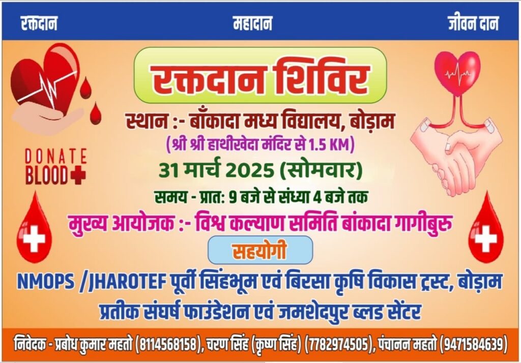 Patamda: विश्व कल्याण समिति बांकादा-गागीबुरु, झारोटेफ पूर्वी सिंहभूम, बिरसा कृषि विकास ट्रस्ट बोड़ाम एवं प्रतीक फाउंडेशन जमशेदपुर के संयुक्त तत्वावधान में बांकादा मध्य विद्यालय में शनिवार को बारिश के कारण रक्तदान शिविर को स्थगित कर दिया गया। शिविर का आयोजन अब 31 मार्च को होगा।