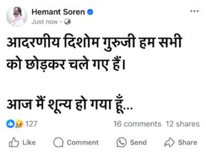 इसके बाद पूरे राज्य में शोक की लहर दौड़ गई। इस संबंध में झामुमो नेता पिंटू दत्ता ने कहा कि झारखंड आंदोलन के जनक और जन जन के नेता गुरुजी शिबू सोरेन के निधन से मर्माहत हूं।