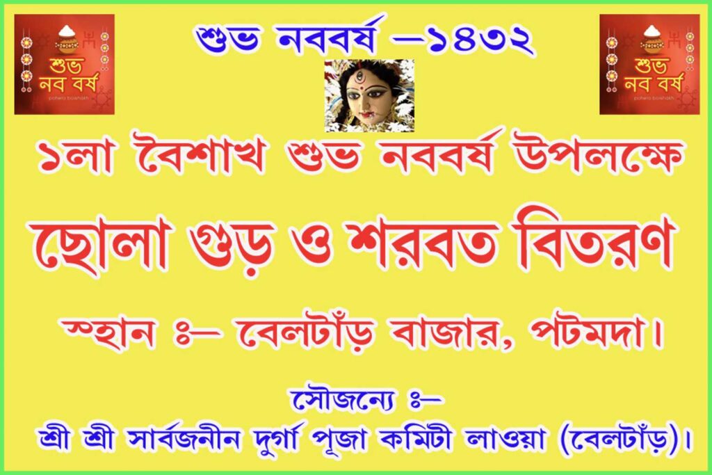 Patamda: श्री श्री सार्वजनिक दुर्गा पूजा समिति लावा (बेलटांड़) की ओर से मंगलवार को पटमदा के बेलटांड़ चौक परिसर में बांग्ला नववर्ष मनाया जाएगा। इसकी जानकारी देते हुए समिति के महासचिव विजय कुमार मंडल ने बताया कि पहला वैशाख के दिन सुबह 10 बजे से गुड़, चना और शरबत का वितरण सैंकड़ों लोगों के बीच किया जाएगा। साथ ही बांग्ला भाषा एवं संस्कृति के संरक्षण की दिशा में दर्जनों बांग्ला भाषा प्रेमियों के बीच पंचांग का वितरण किया जाएगा।