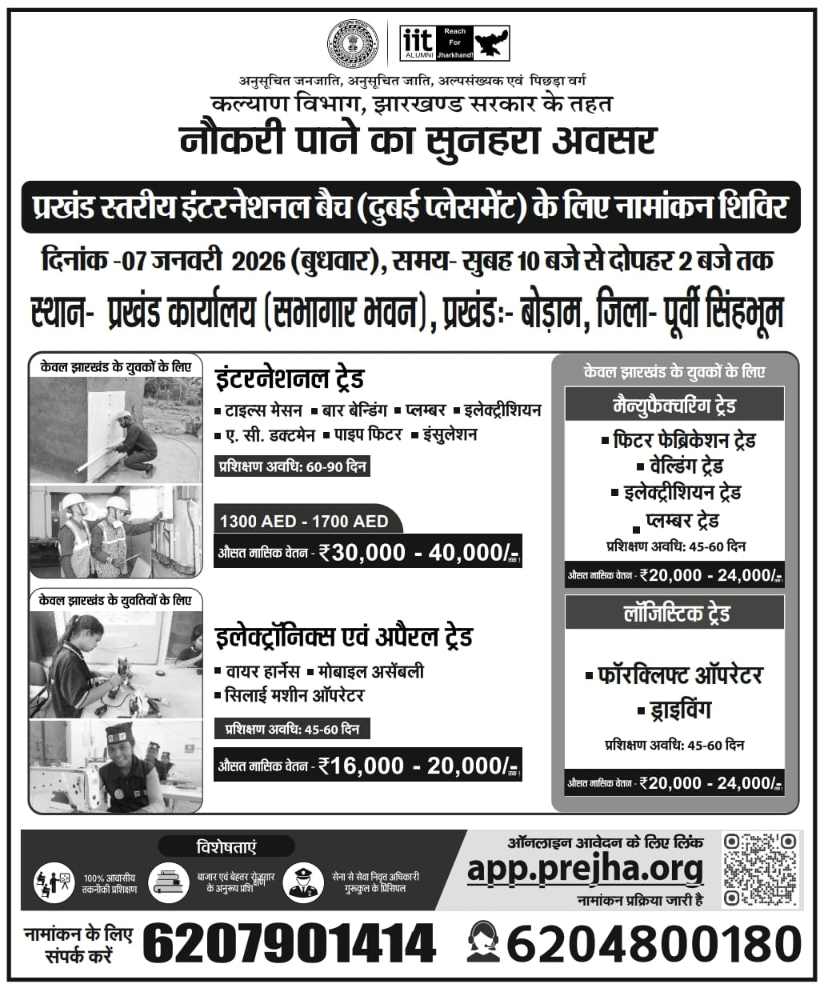 बीडीओ किकू महतो ने बताया कि इंटरनेशनल और डोमेस्टिक बैच में रोजगार के लिए नामांकन शिविर का आयोजन किया गया है जो भी युवक या युवतियां रोजगार करना चाहते हैं और अपने भविष्य को बेहतर बनाना चाहते हैं वे 7 जनवरी 2026 को सुबह 10 बजे से दोपहर 2 बजे तक बोड़ाम प्रखंड कार्यालय में आकर अपना नामांकन करवा सकते हैं। इसके लिए योग्यता 8 वीं से 12 वीं पास, आयु सीमा 18 से 32 वर्ष है। आवश्यक दस्तावेज आधार कार्ड, पासपोर्ट साइज एक कॉपी फोटो की जरूरत है। विस्तृत जानकारी एवं नामांकन के लिए संपर्क नंबर जारी की गई है – 6207901414
