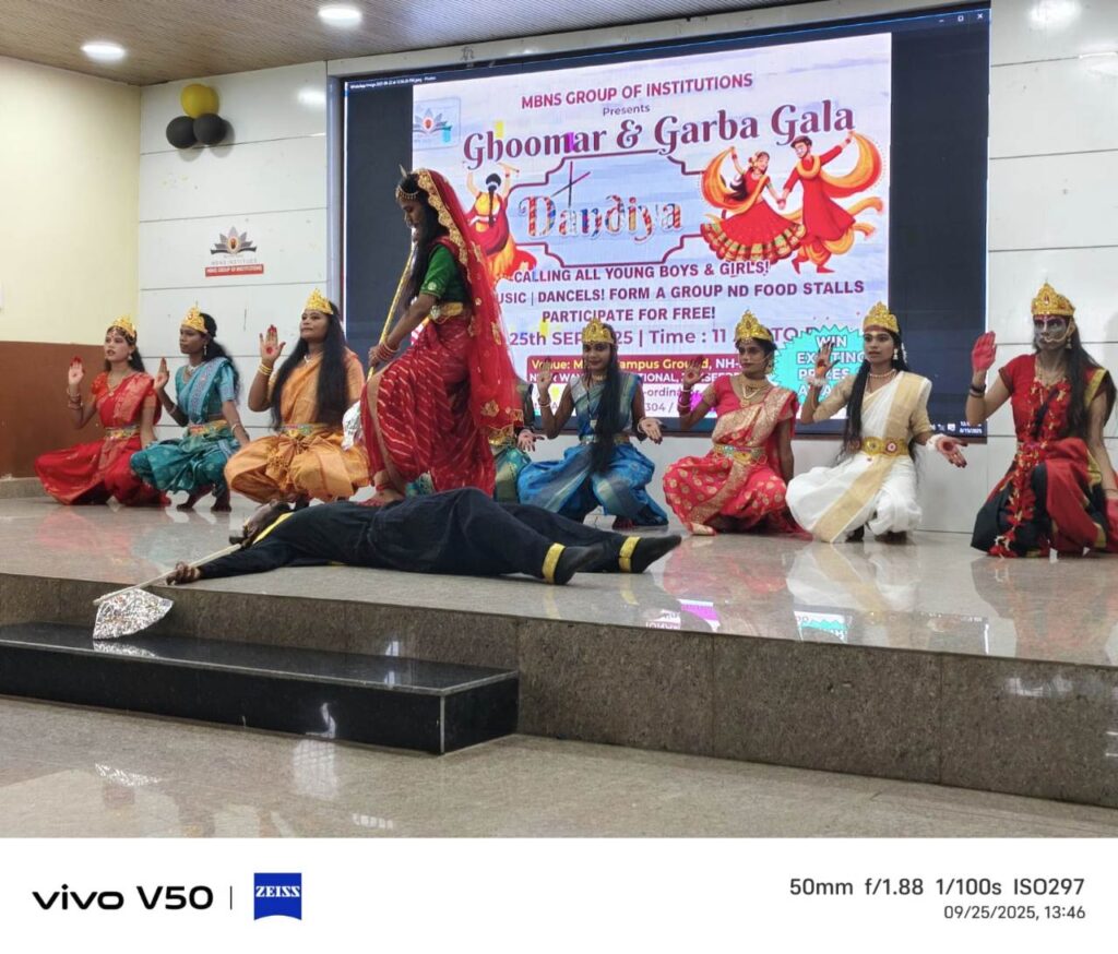 एमबीएनएस समूह के संस्थानों ने दुर्गा पूजा महोत्सव के अवसर पर घूमर और गरबा गाला-2025 के आयोजन से छात्रों और पूर्व छात्रों को अपनी संस्कृति और परंपराओं से जुड़ने का अवसर प्रदान किया। कार्यक्रम की सफलता के लिए आयोजन समिति ने कड़ी मेहनत की और सभी का आभार व्यक्त किया।