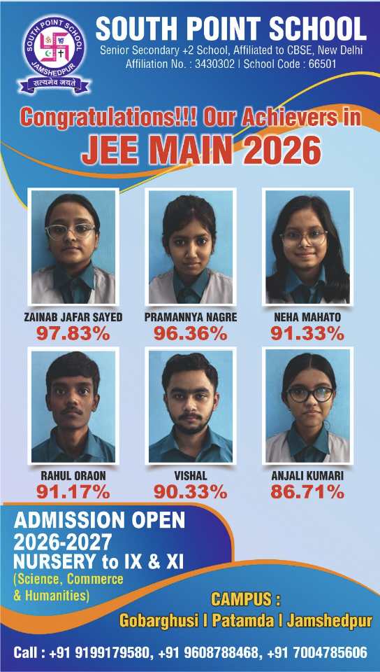 Patamda: साउथ प्वाइंट स्कूल, पटमदा के छह विद्यार्थियों ने जेईई मेन 2026 (सेशन- 1) में उत्कृष्ट प्रदर्शन करते हुए अपना परचम लहराया। विद्यार्थियों ने उत्कृष्ट अंक प्राप्त कर अपने परिवार, विद्यालय और पूरे क्षेत्र का नाम गौरवान्वित किया है। जेईई मेन परीक्षा 2026 में ज़ैनब जाफ़र सईद ने 97.83 प्रतिशत अंक प्राप्त कर विद्यालय में सर्वोच्च स्थान हासिल किया। प्रमाण्य नागरे ने 96.36 प्रतिशत अंक प्राप्त कर द्वितीय स्थान प्राप्त किया। नेहा महतो (91.33 प्रतिशत), राहुल ओरांव (91.17 प्रतिशत), विशाल (90.33 प्रतिशत) तथा अंजलि कुमारी (86.71 प्रतिशत) ने भी उल्लेखनीय सफलता प्राप्त कर अपनी प्रतिभा का परिचय दिया।