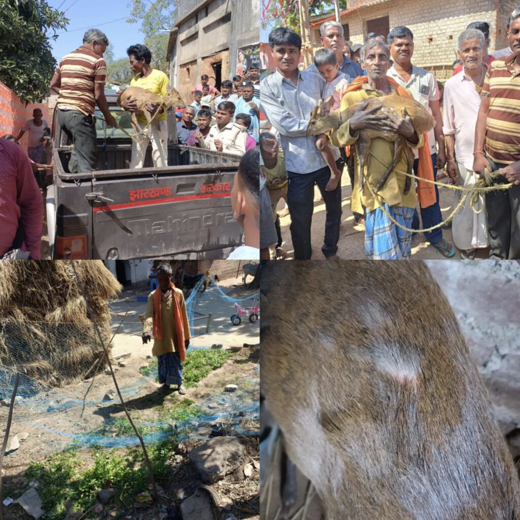 दलमा के जंगल से भागकर आया हिरण, बोड़ाम में कुत्तों के हमले में घायल हिरण को ग्रामीणों ने वन विभाग को सौंपा