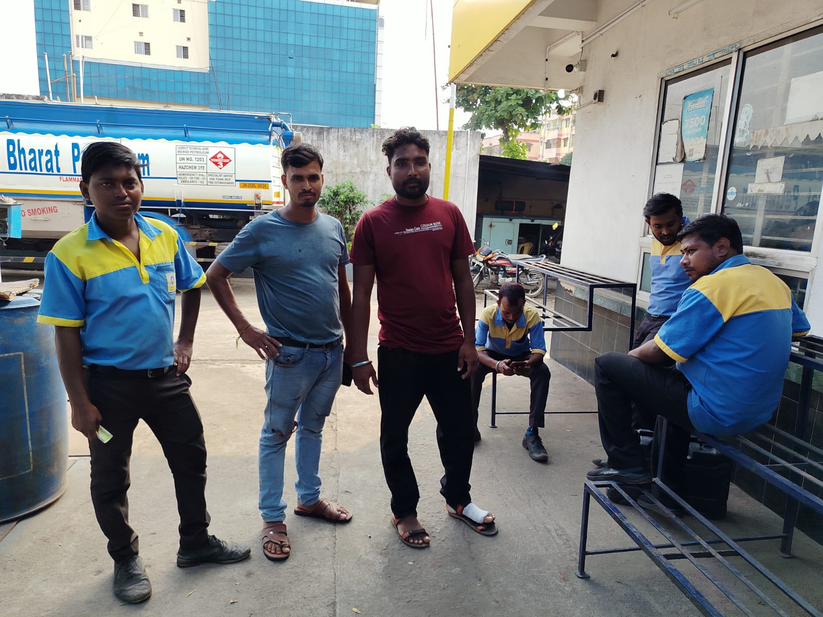 शुक्रवार को संकोशाई के पेट्रोल पंप पर खड़े मजदूर देवशरण महतो (मैरून कलर के टीशर्ट में)
